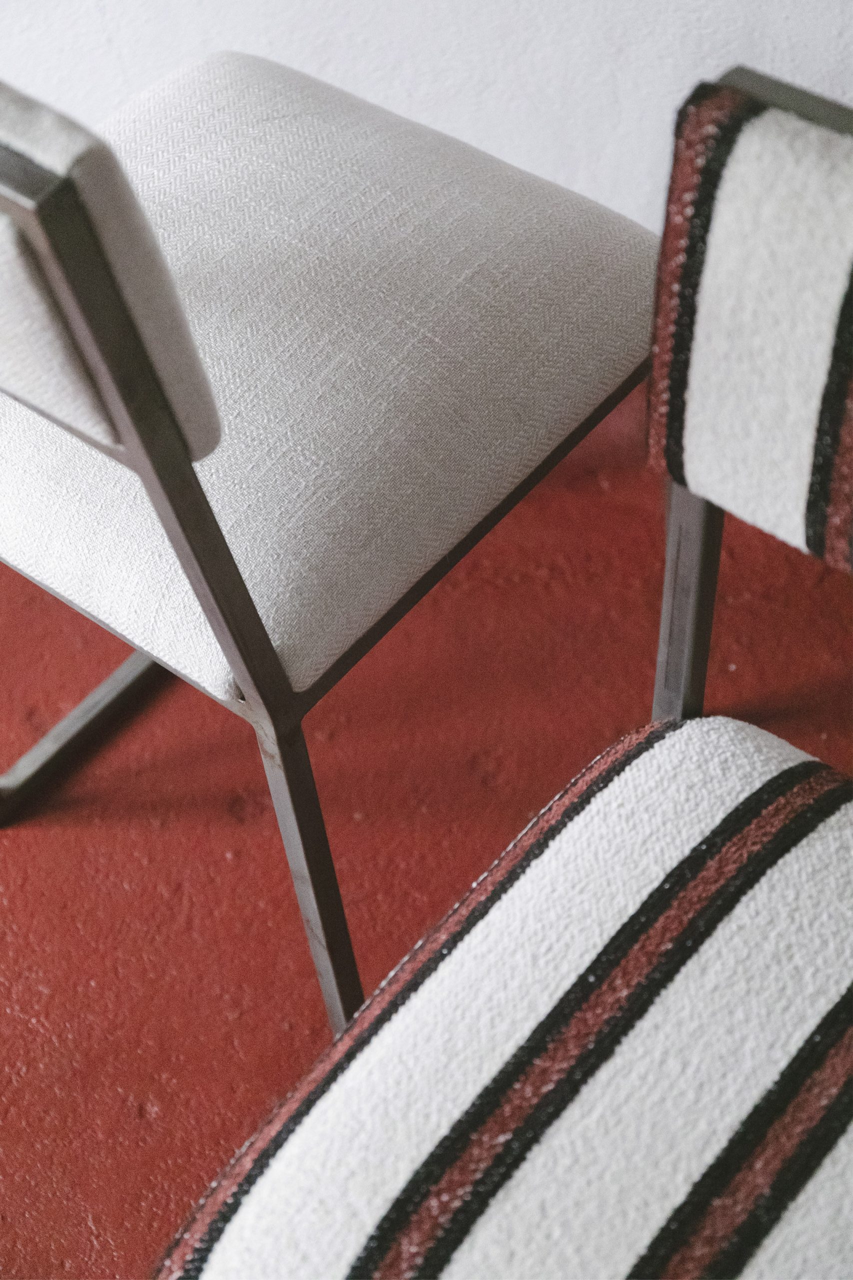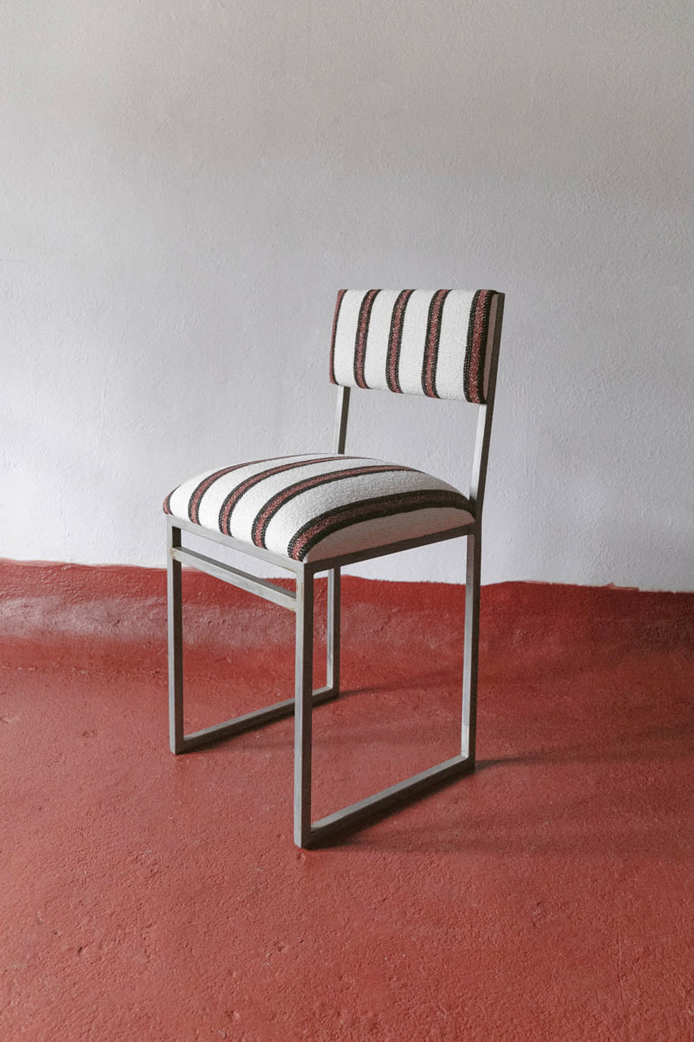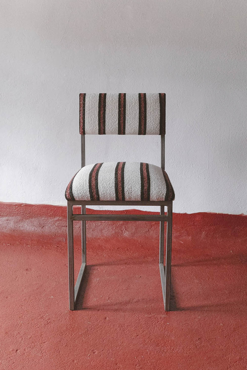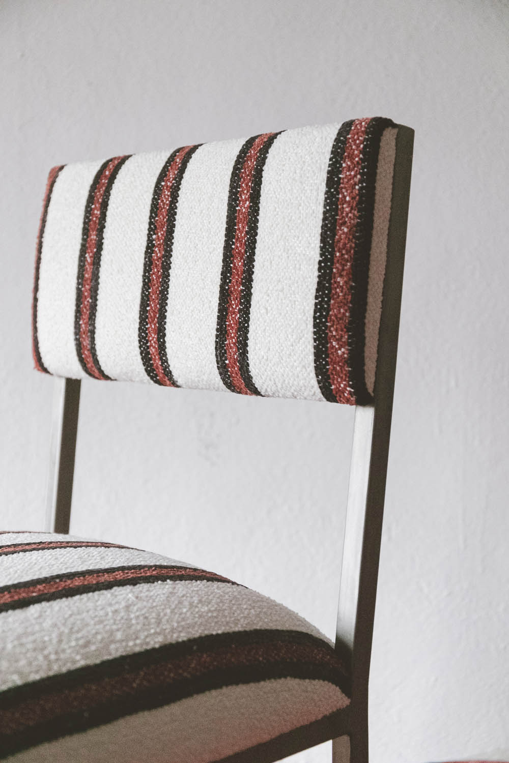 Estructura de hierro tapizada en tela a rayas texturizada.